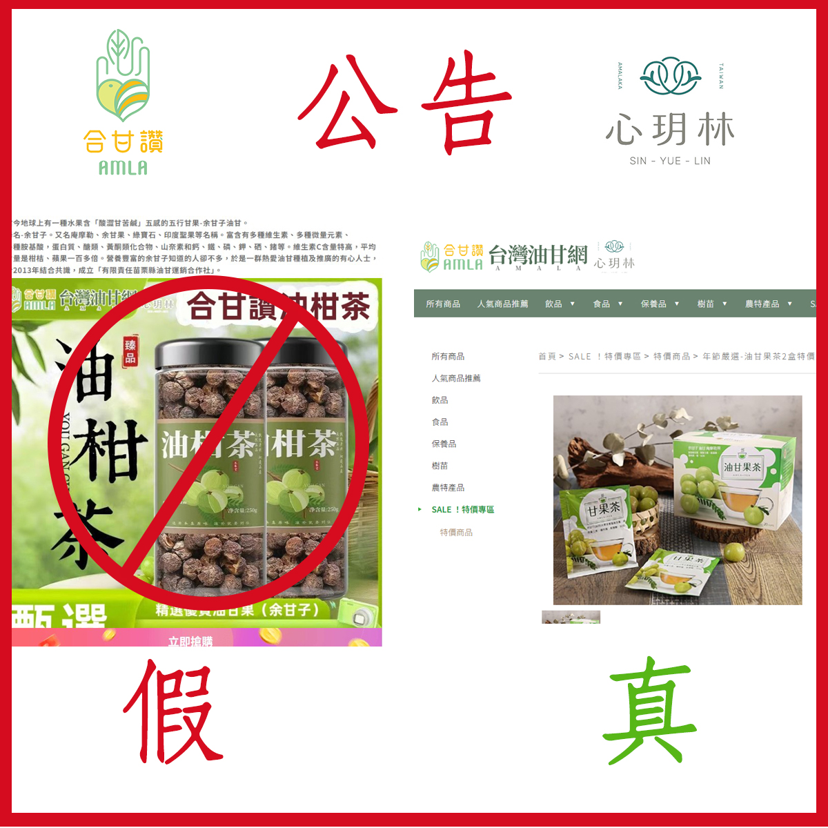 首頁 > > 公告 公告 2025/12/4 本公司網站<台灣油甘網>及品牌<合甘讚>被不肖商人冒用,特此聲明,本公司的油甘果茶為冷凍乾燥,顏色為白黃綠色不是黑褐色,無罐裝產品,請認明此包裝,要賣東西就要用自己的品牌跟網站,不要盜用別人的,隨便用別人的照片影音圖像品牌賣來路不明的東西你敢吃嗎? 回上頁